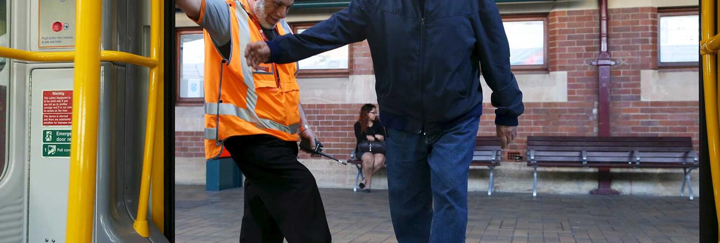 Station staff can assist you with getting on and off trains. Upon arrival at the station or when using transport apps, check if the station is attended. If a staff member cannot be easily located, contact details will be displayed or are available using the apps.